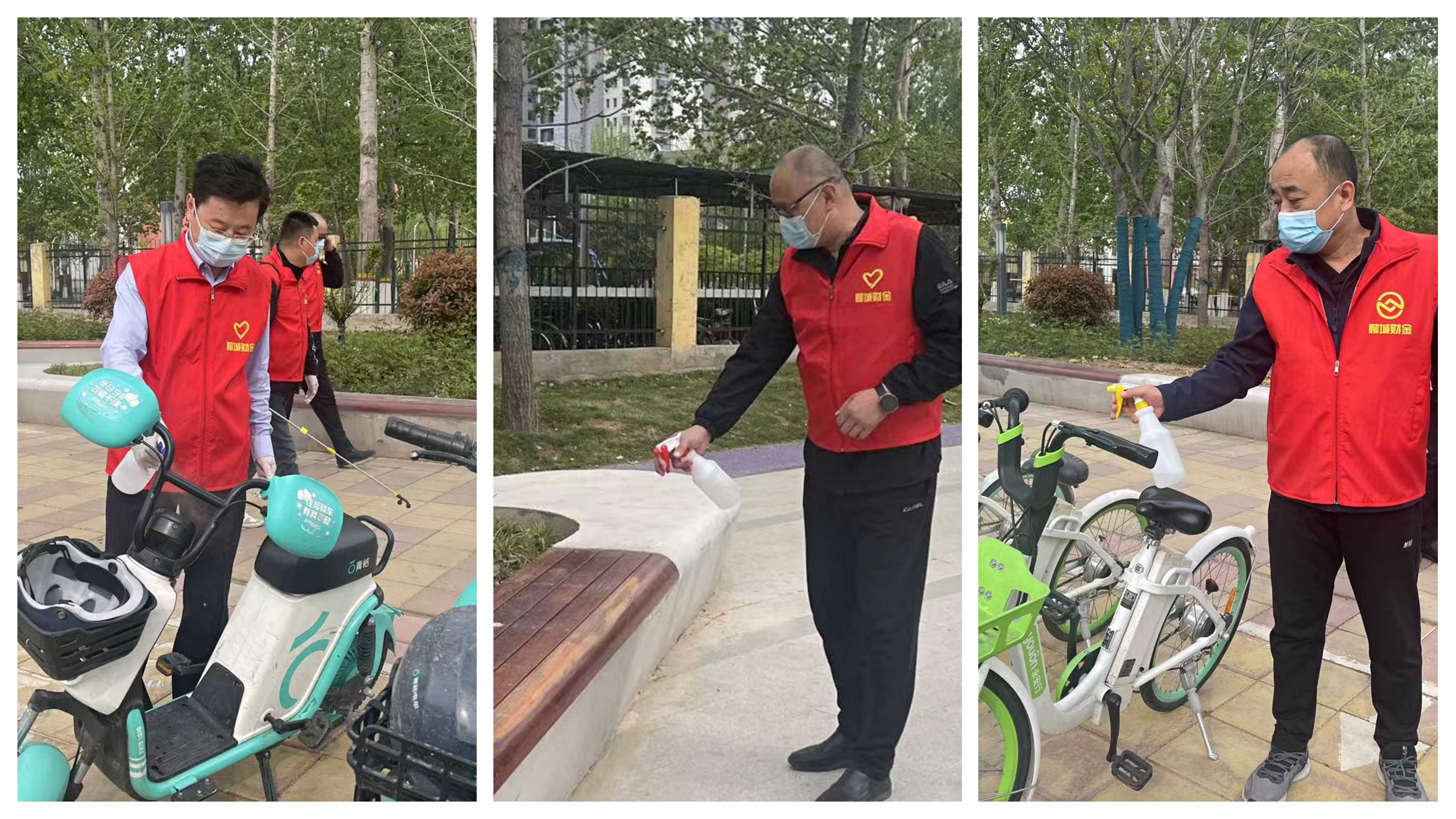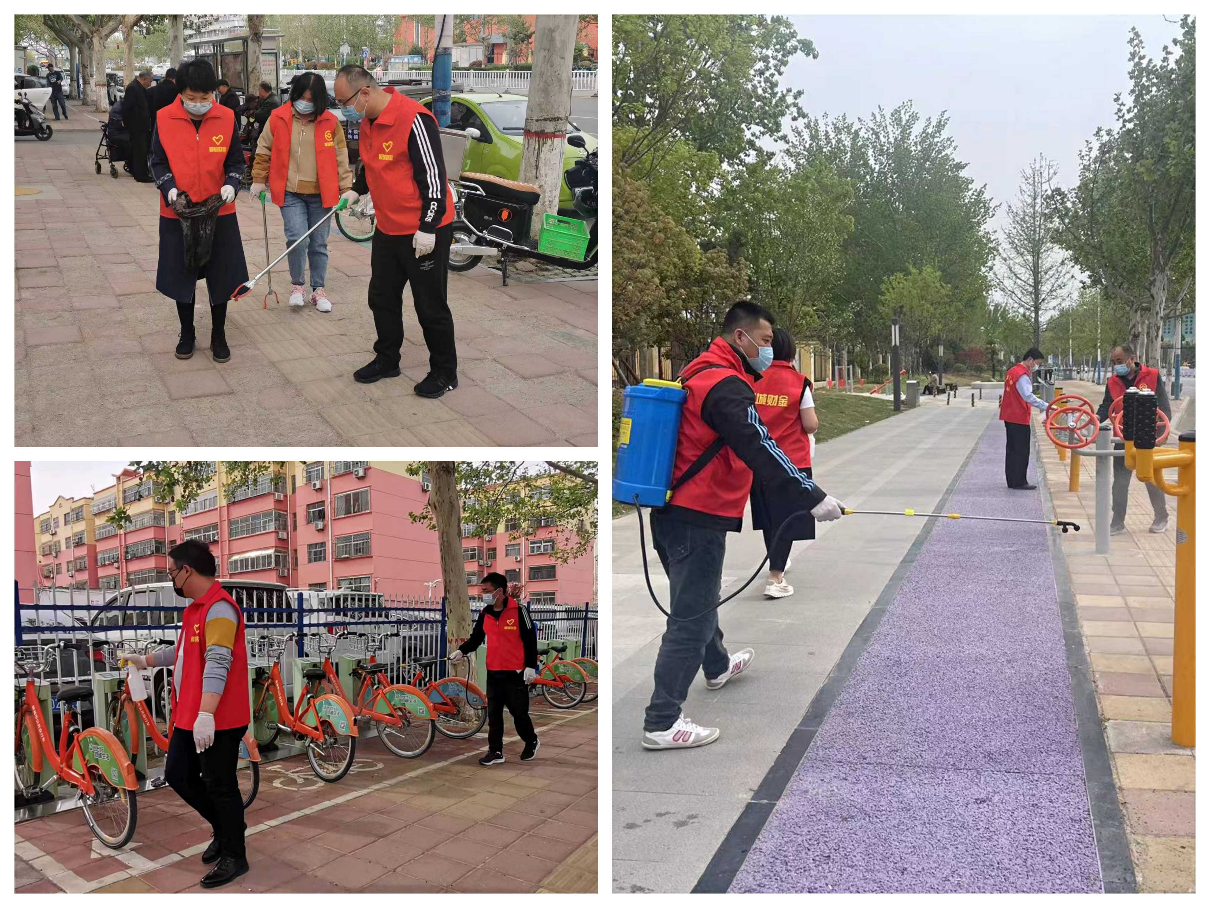 活動(dòng)開展過程中,志愿者們嚴(yán)格按照防疫規(guī)定佩戴口罩、手套,做好自身防護(hù),同時(shí)對過往群眾宣講疫情防控規(guī)定,提醒佩戴口罩和遵守防疫距離,勸阻扎堆聚集行為。有的同志手持酒精噴壺對路旁健身器材、坐椅、公共自行車等公共設(shè)施進(jìn)行消毒,有的同志身背消毒水噴霧器進(jìn)行大面積路面消殺,有的同志使用工具對地面和綠化帶中垃圾進(jìn)行清理。