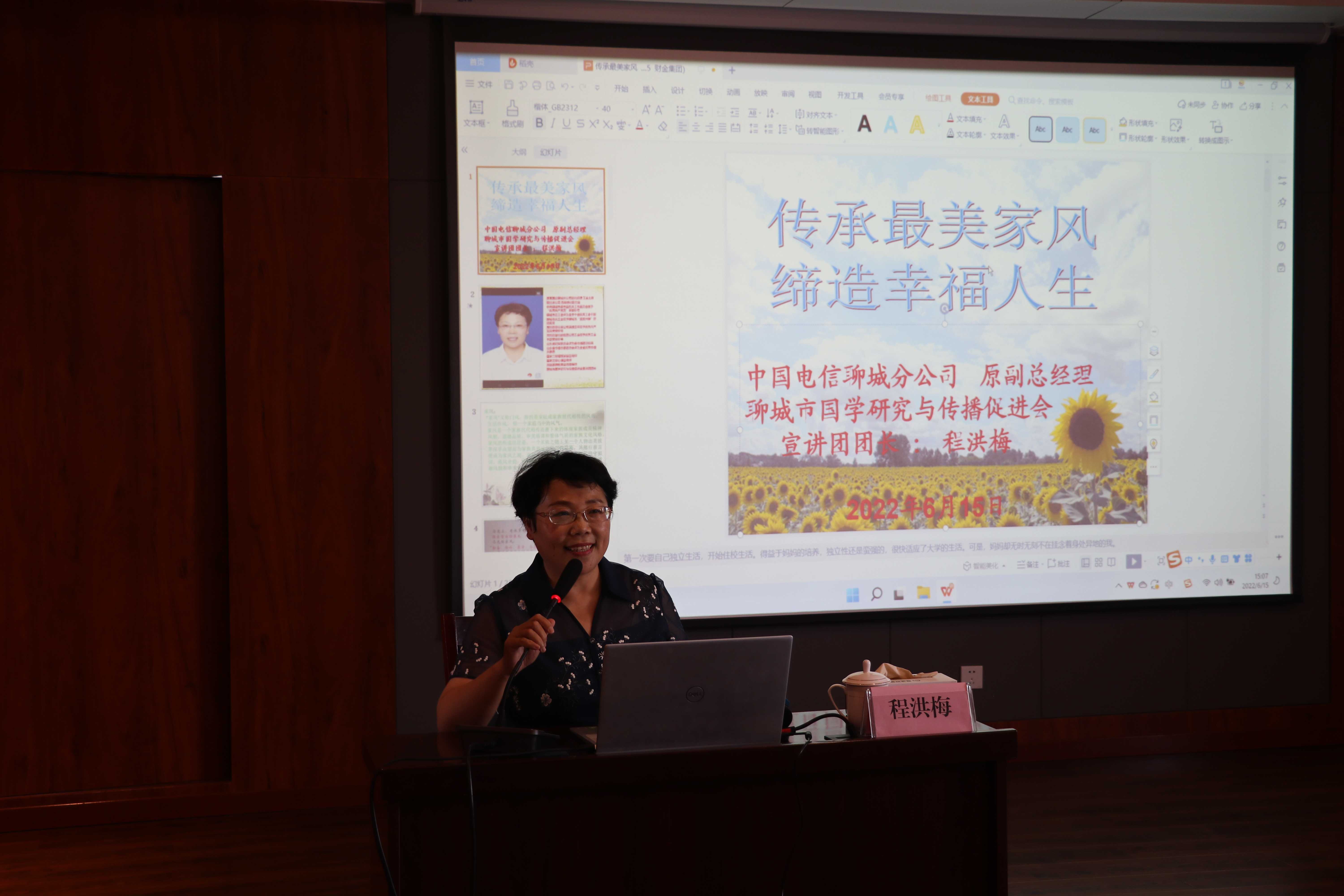 本次講座邀請聊城市國學(xué)促進會宣講團團長程洪梅講授。講座圍繞家風、家庭關(guān)系生動講授了“傳承最美家風,締造幸福人生等”內(nèi)容。通過實例分析的方式,為大家營造輕松、愉悅的氛圍。